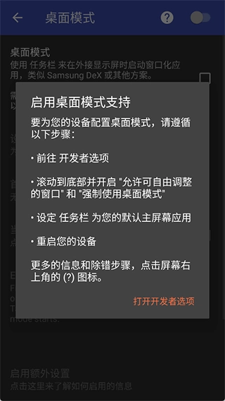 使用桌面模式,需配备USB转HDMI适配器(或者使用笔记本电脑),以及支持视频输出的兼容设备。另外,部分设置还需借助adb授予特殊权限。