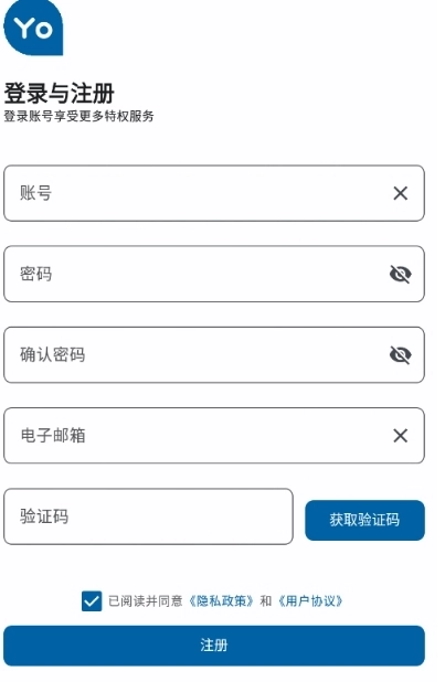 4、设置账号密码与电子邮箱,获取验证码后填写完成注册