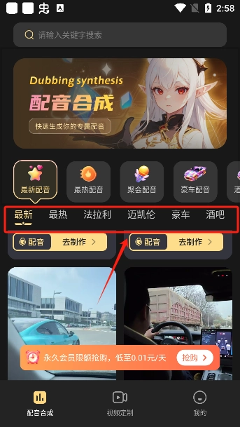 1、打开软件进入到配音合成板块可以看到许多类型的音频