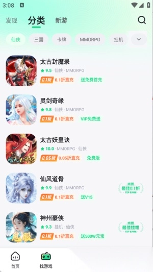 3. 在“找游戏”页面,游戏被细致地划分了类别,涵盖三国、传奇以及卡牌等多种类型。